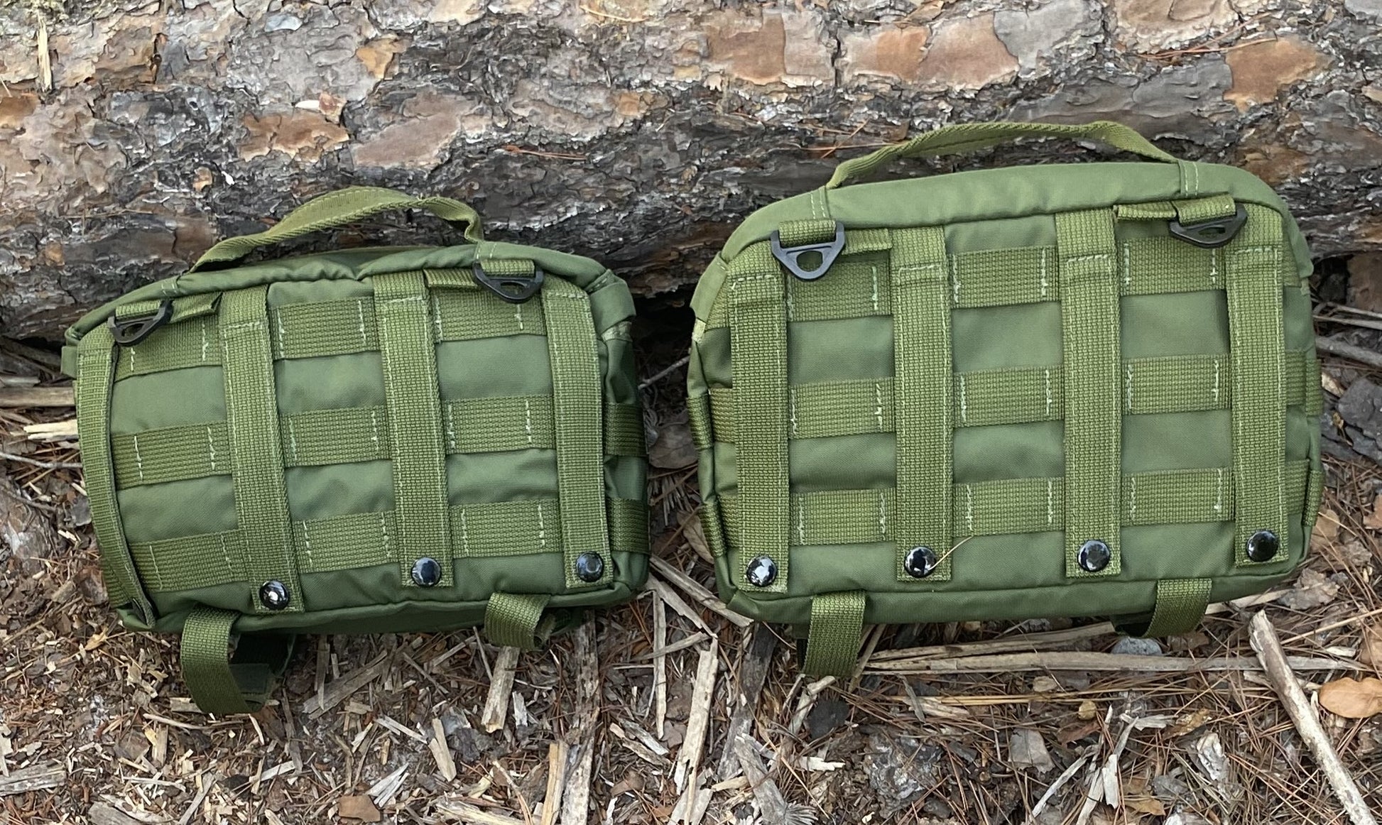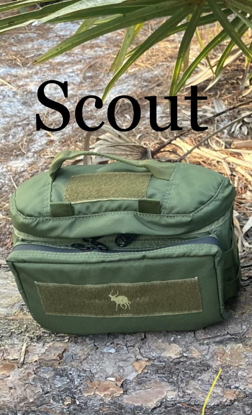 Our improved and modernized version of the famous butt pack. MOLLE compatible. Loops for shoulder straps too! Designed for our Bushmaster Belt but they will fit most any PALS panel. They can also be used stand-alone (the Scout makes a great "lunch bucket" or shaving kit bag). The small front zippered pockets will hold a couple of 30 round 5.5.6 magazines or a box of 375 H&H. The bottoms have built-in webbing straps that are great for holding things such as a poncho or ground pad. These are awesome packs and at a great price too!