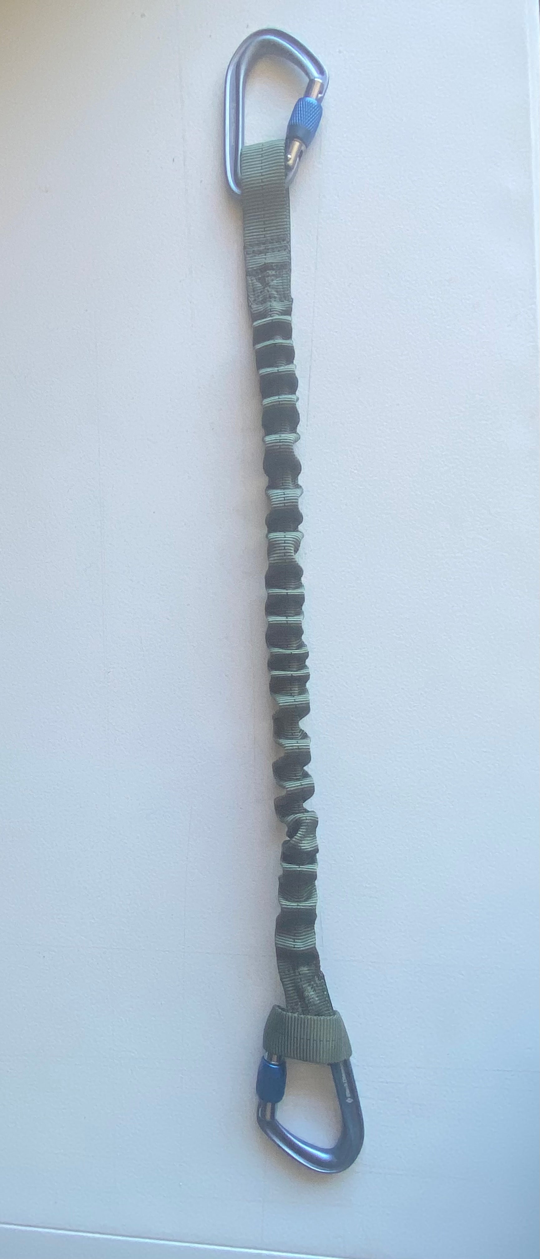 3' Stretched Length Tactical Laynard - made with Mil-Spec Mil-W-5625k tubular webbing with bungee center. Flat loop on one end, half-twist loop on other end. No hardware - we recommend climbing rated locking carabiners. Price includes shipping.